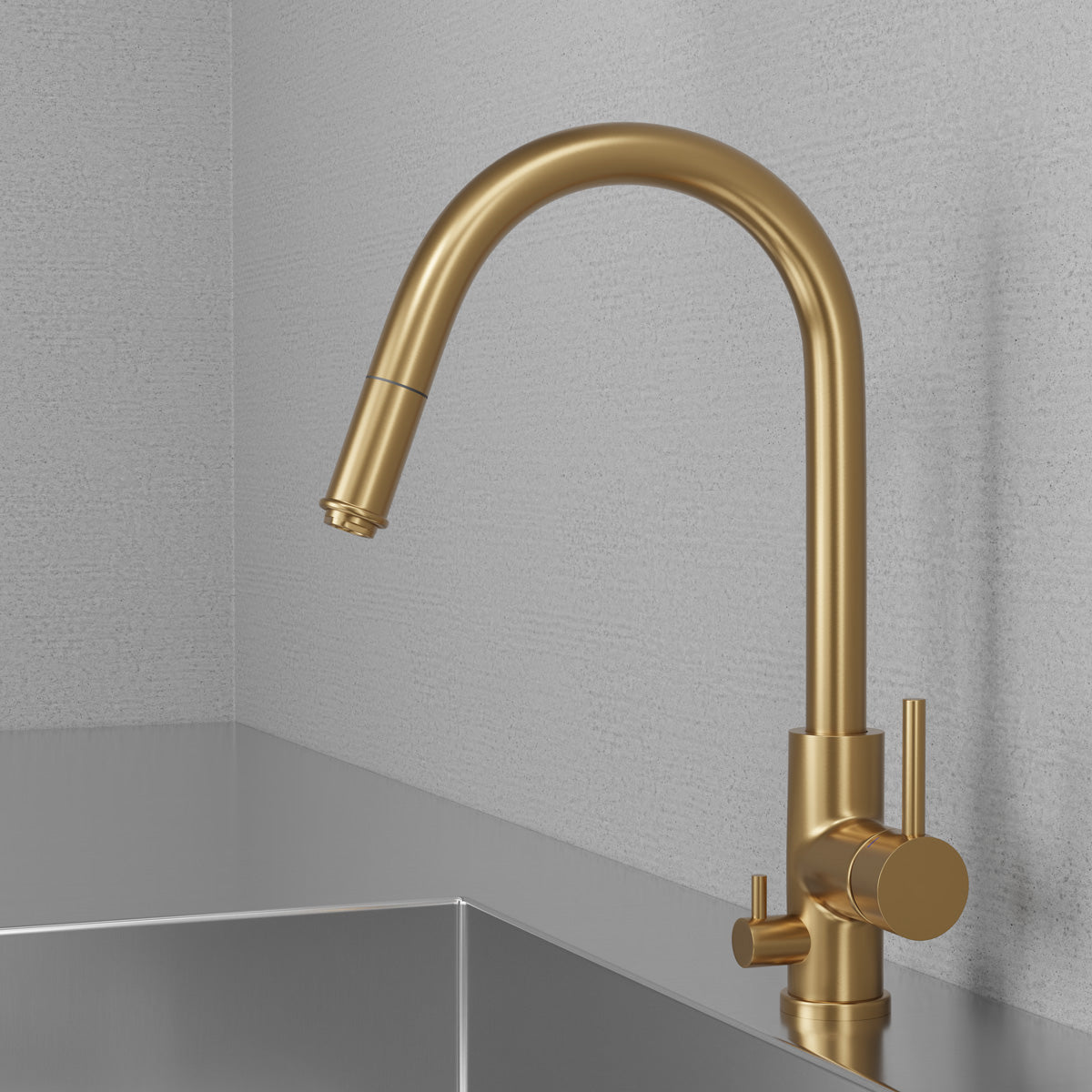 Köksblandare med ett tidlöst formspråk där raka linjer möter mjuka, försedd med diskmaskinsavstängning. Utdragbart munstycke som förenklar vid rengöring.