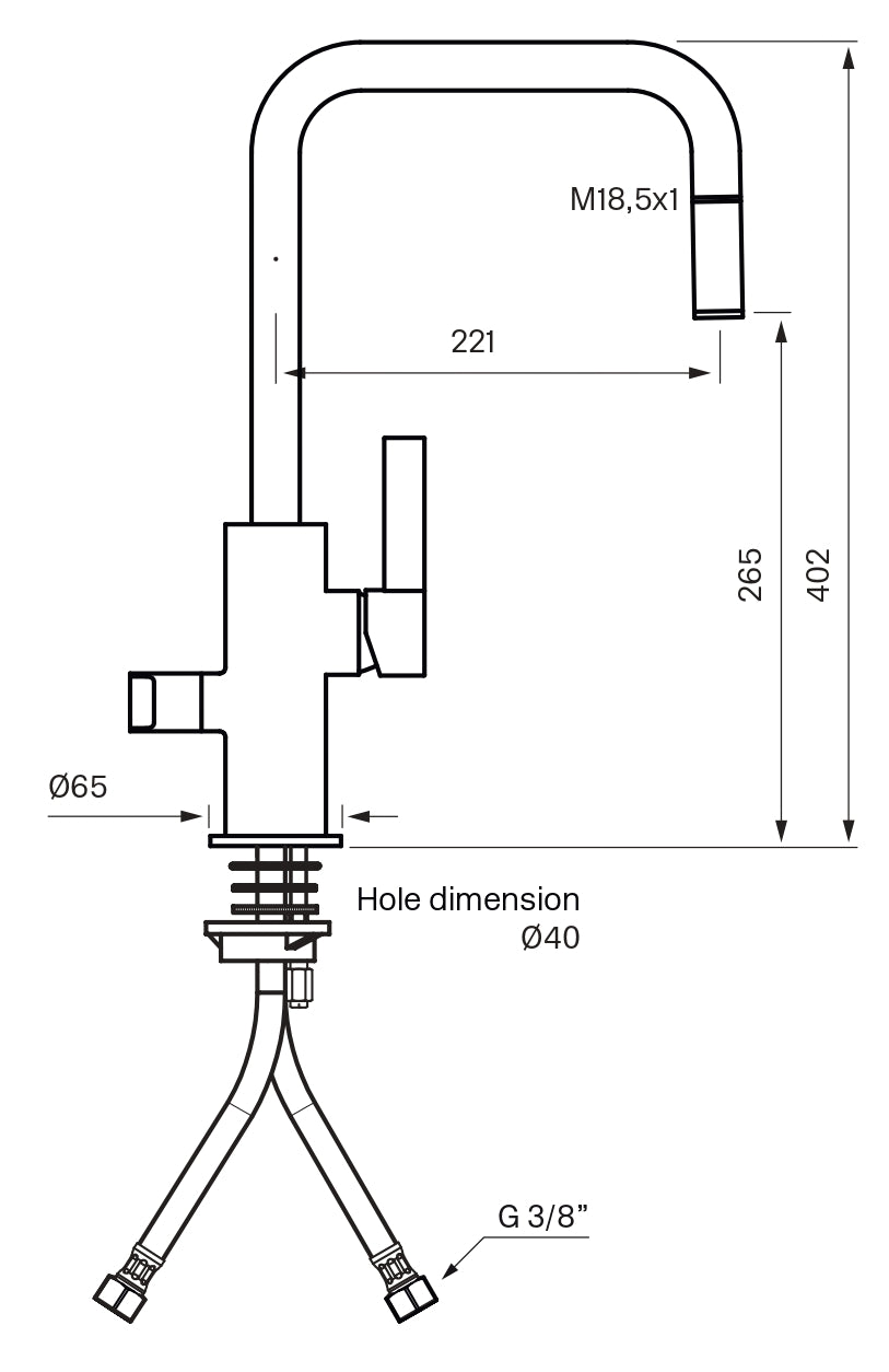 Köksblandare med svängbar pip, diskmaskinsavstängning och utdragbart munstycke. OBS - håltagning Ø40 mm. Pipens svängradie går att begränsa till mellan 60 och 270 grader med 15 graders intervaller.