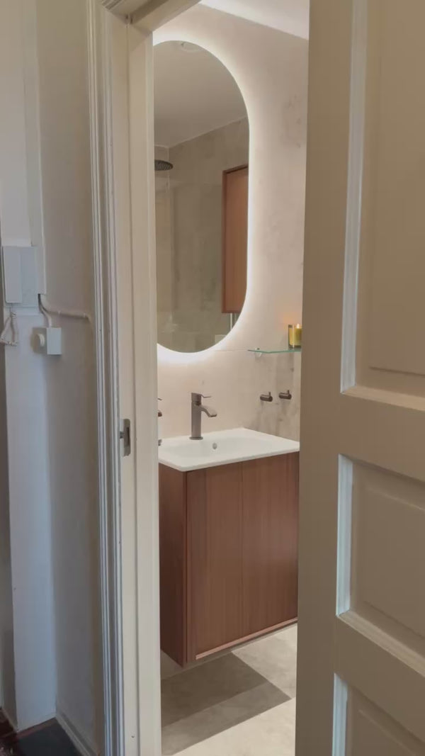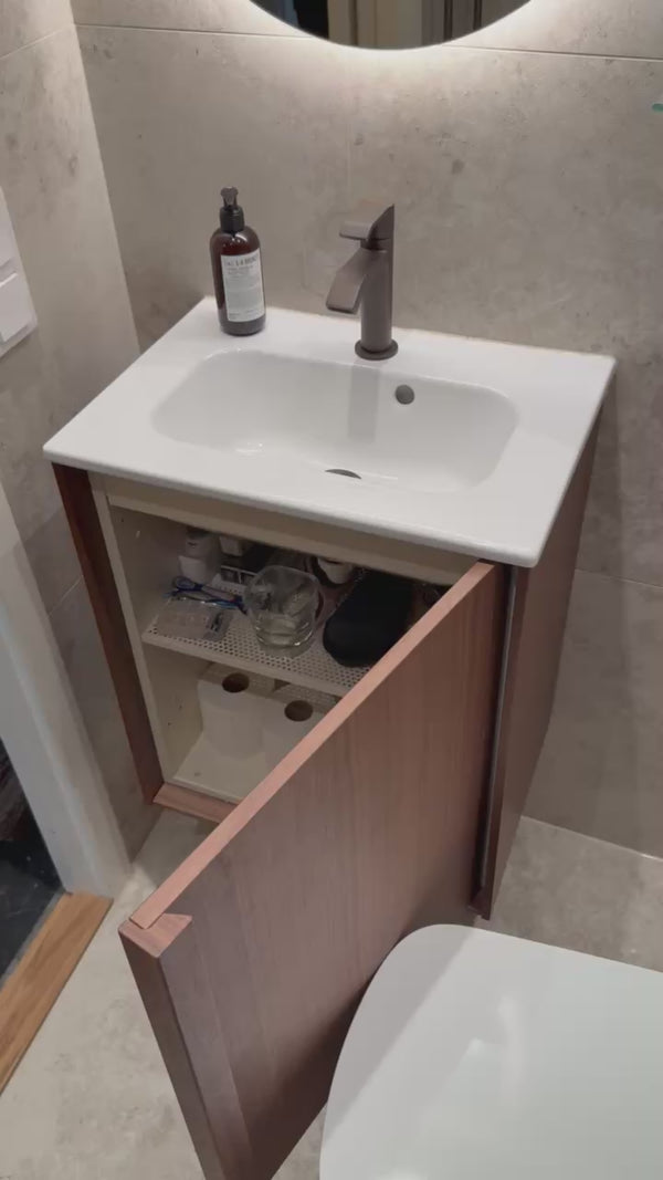 Badrumsmöbel i äkta trä med grepplist och miljövänlig ytbehandling. Monterat eluttag och startkit-inredning ingår.