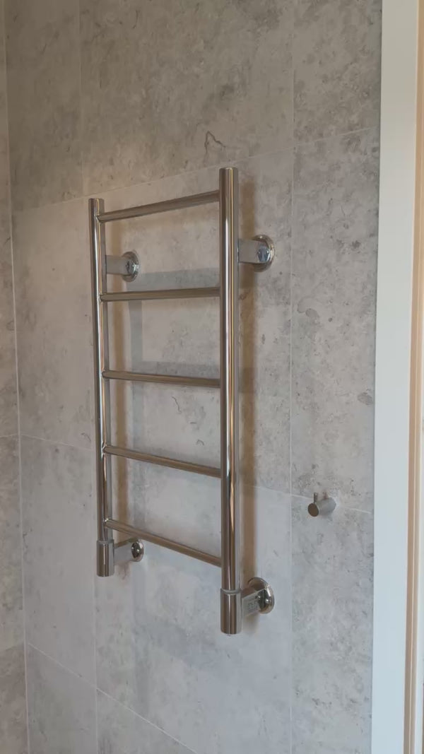 Avskalad handdukstork med smal bredd, passar därmed utmärkt i mindre badrum. En okomplicerad elektrisk modell med låg elförbrukning och smidigt handhavande. Almenäs finns i polerat rostfritt och två storlekar.