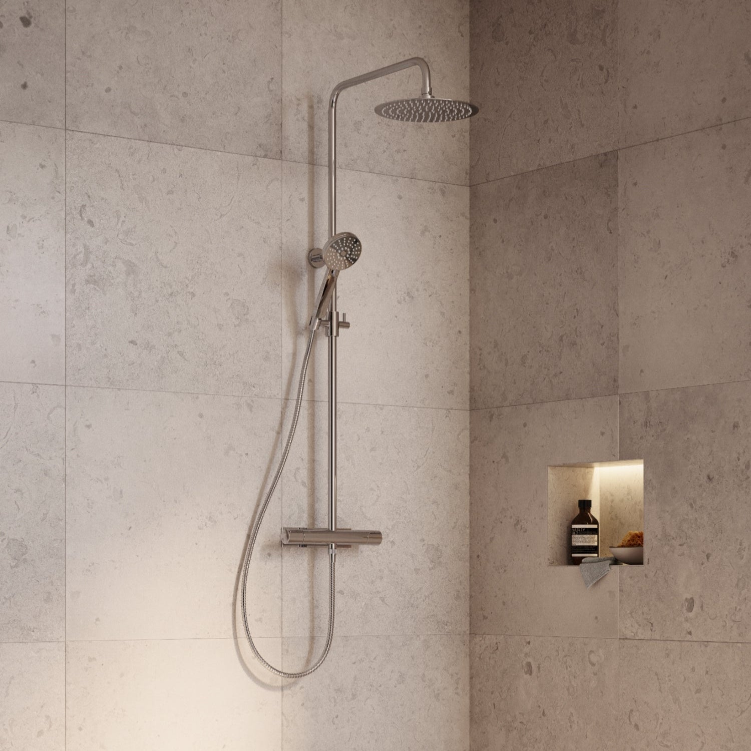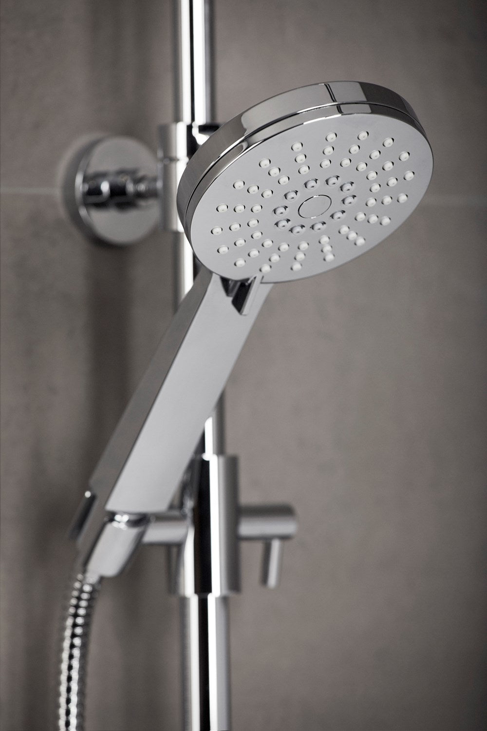 Mist är en i höjdled justerbar takdusch i förkromad mässing med rund taksil som passar till de flesta stilar men kanske allra bäst till duschlösningarna i Linc. I termostatblandaren ryms flera innovativa tekniker, såsom Safe Temp med unik vattentrycks- och temperaturkontroll vilket gör din duschupplevelse extra njutbar samt Eco Flow och Easy Clean som håller både vattenkostnaden och städtiden nere. Välj bland flera varianter när det gäller både funktion och design. Här varianten med 3-funktionshanddusch med tre olika strålar: Kombipuls, Normal, Puls.