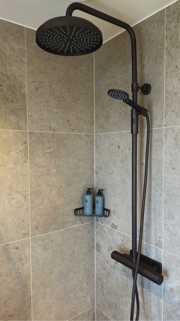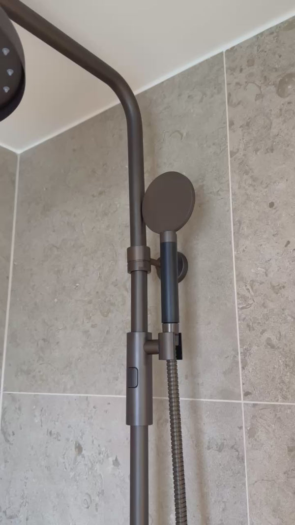 Takduschpaket med tryckbalanserad termostat och omkastare i vred. Duschröret nedanför väggfäste går att kapa efter önskad duschhöjd. 160cc. Kombineras med blandarfäste.