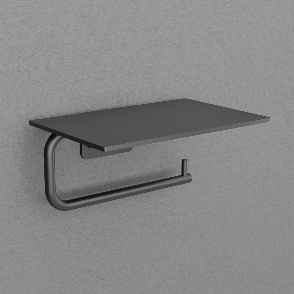 Toalettpappershållare i slimmat formspråk. Utformad med en hylla för praktisk förvaring av mindre föremål.