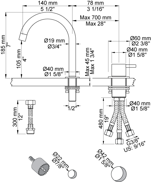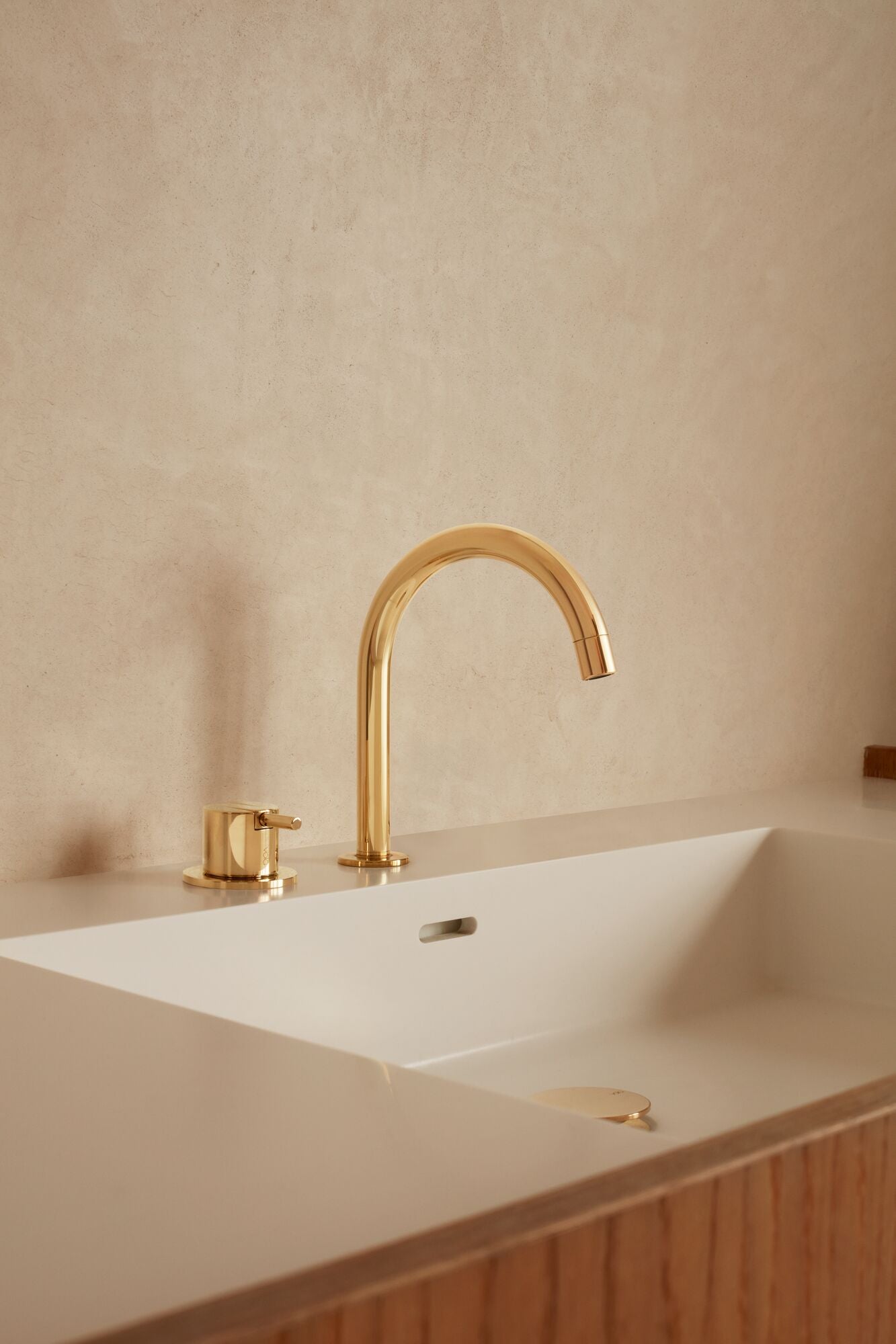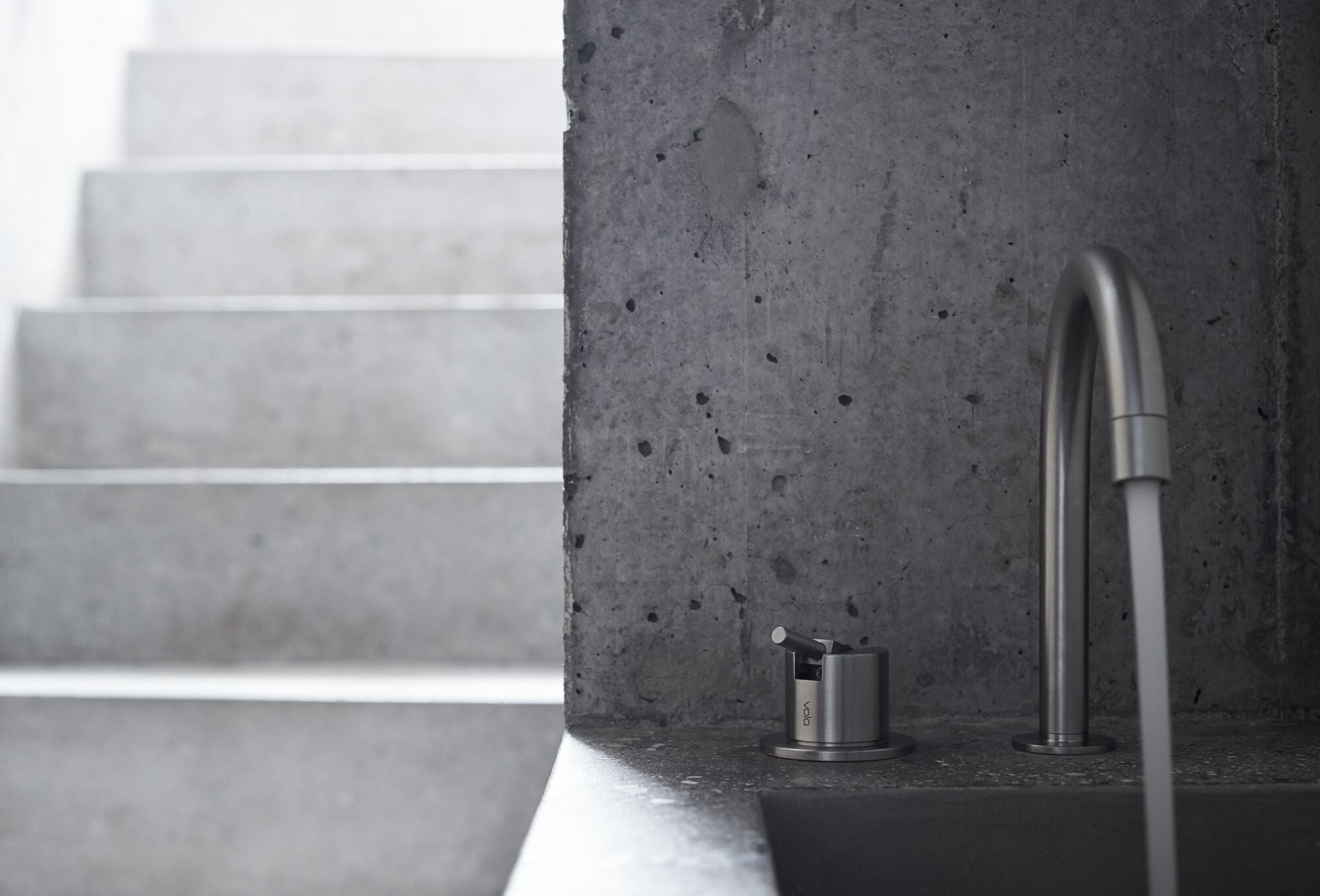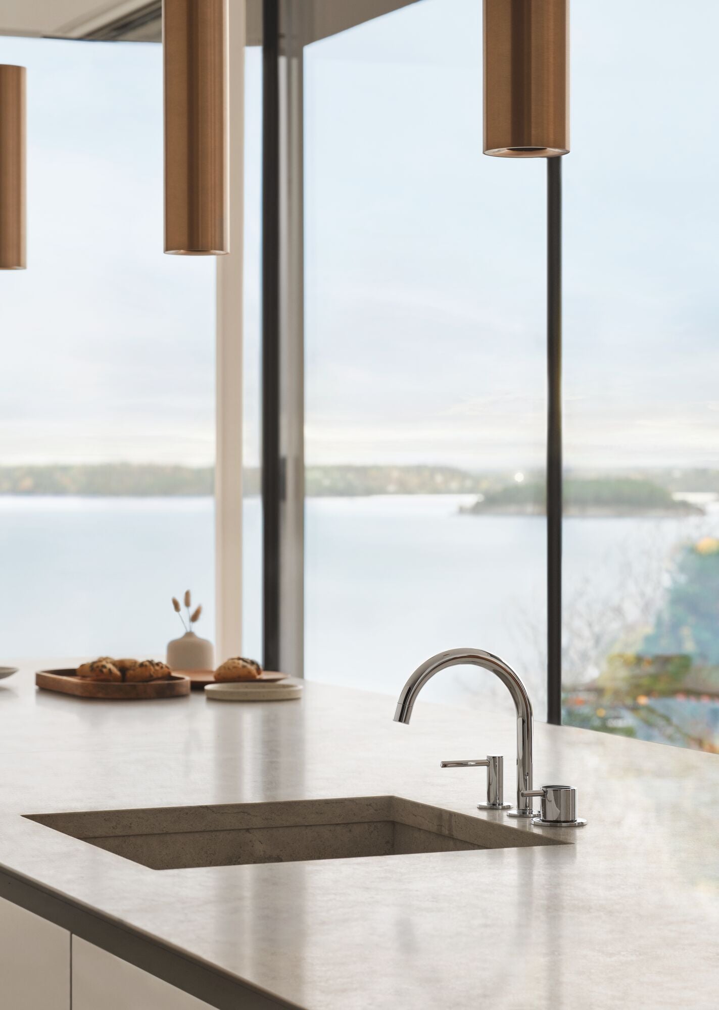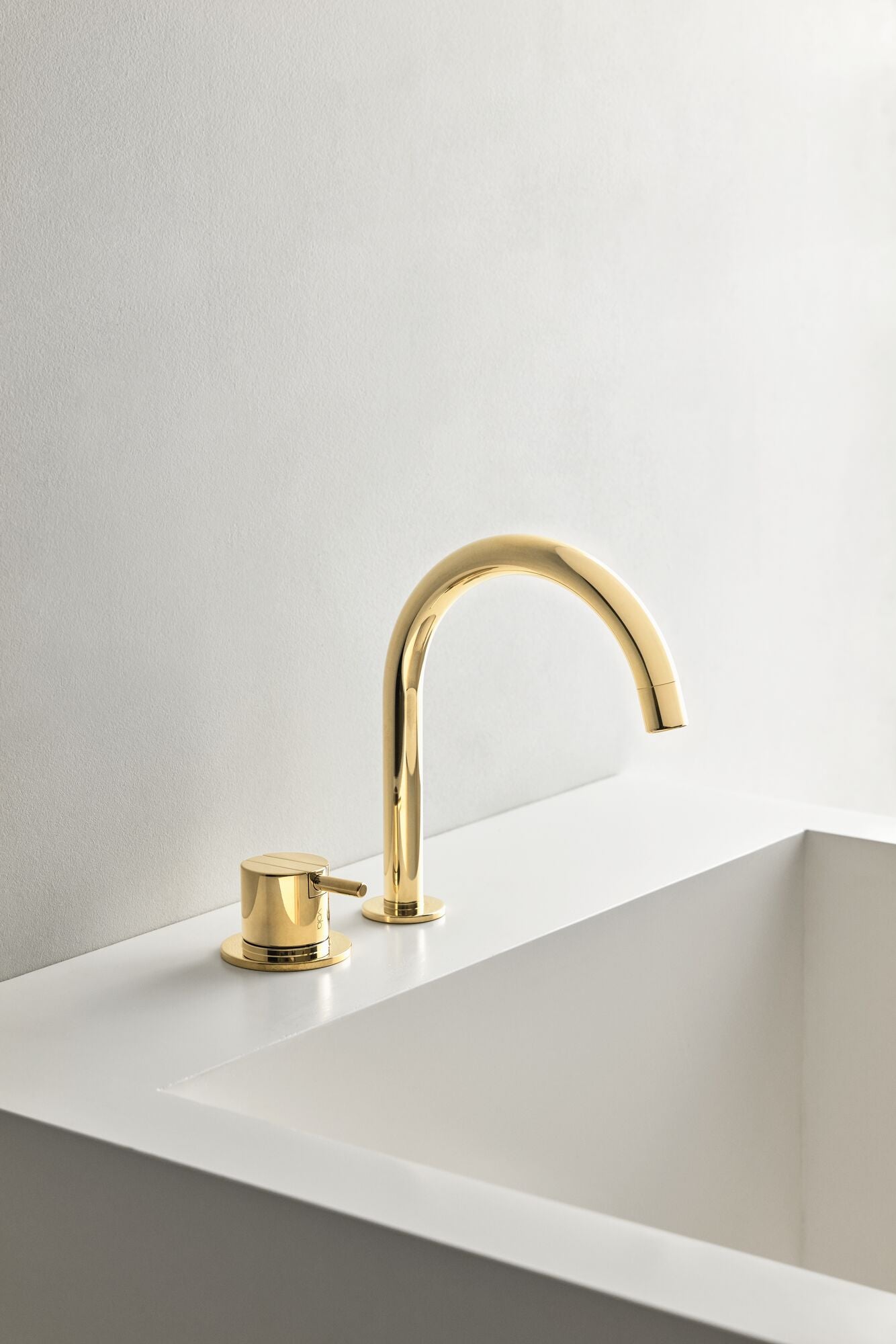 Engreppsblandare med keramisk tätning, för fristående montage 500, 185 mm hög med svängbar pip 090G med vattenbesparande strålsamlare.